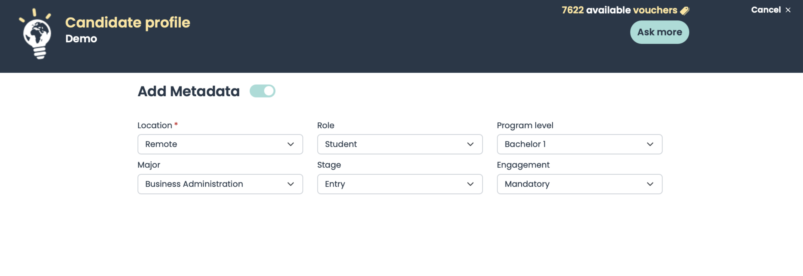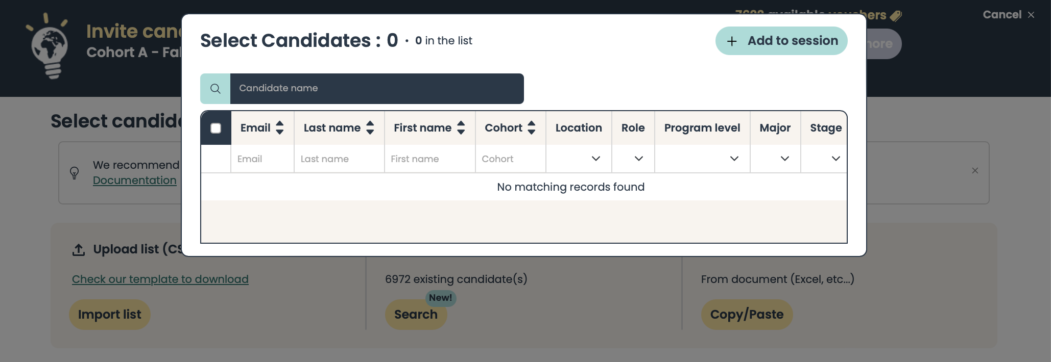 Vous pouvez également ajouter les métadonnées au niveau du candidat lorsque vous invitez des candidats, par exemple via l'option copier/coller ou le téléchargement d'un fichier CSV.