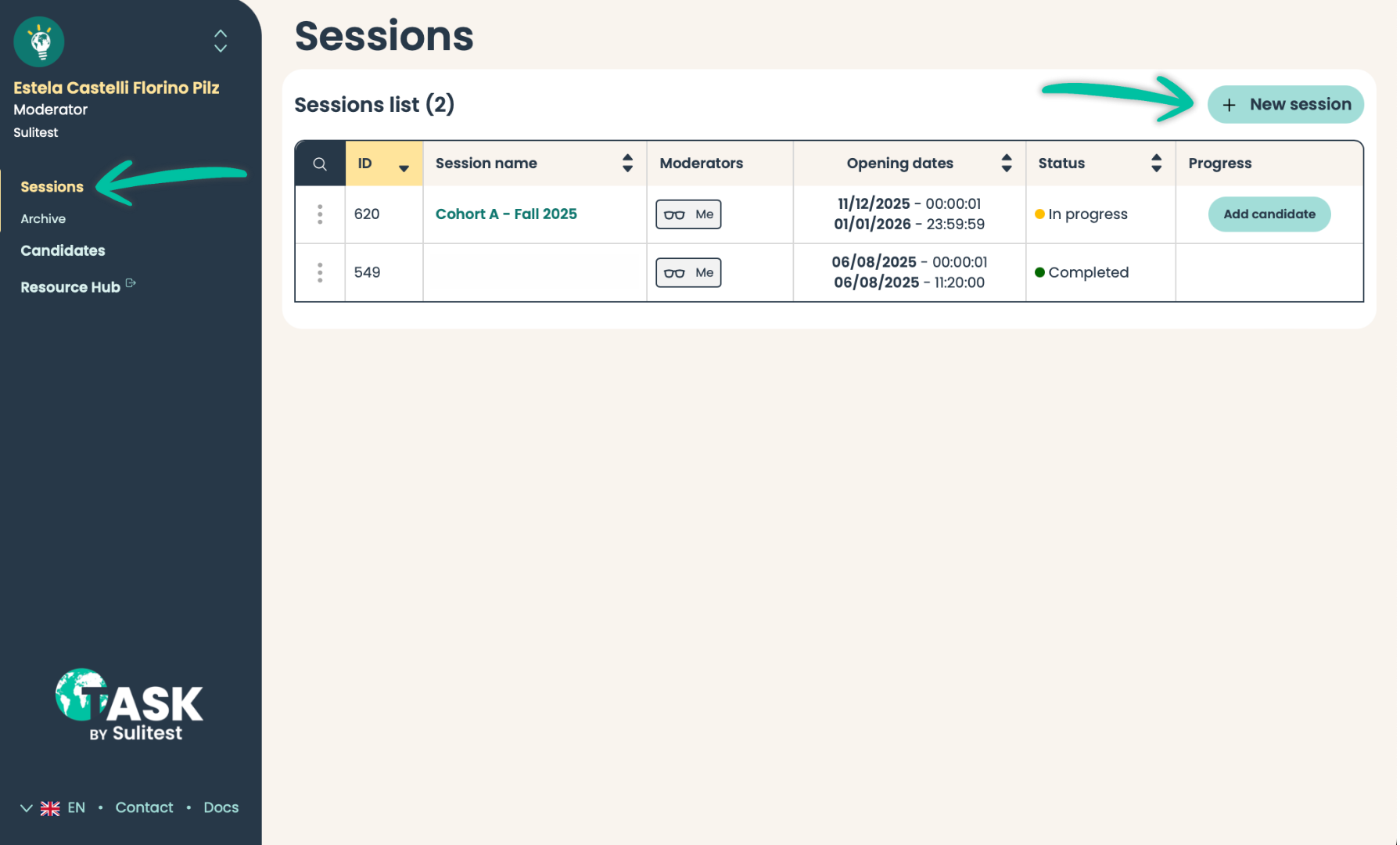 La création d'une session vous permet d'inviter les candidats à participer à TASK™. Suivez les étapes suivantes pour mettre en place une session de manière efficace et garantir une expérience fluide pour les candidats.