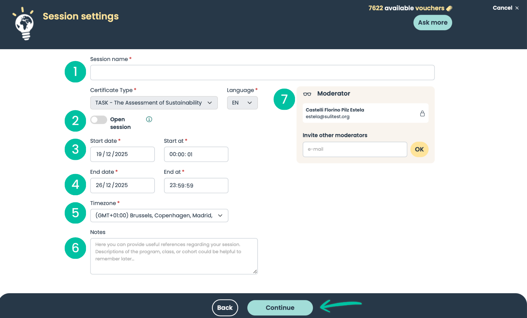 - Nom de la session - choisissez un nom clair et descriptif de la cohorte qui passe le TASK™.